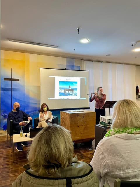 Musikalisch wurde die Lesung von Frau Vera Schneider-Terodde (Vorsitzende des Freundeskreises der Kunst im Uniklinikum Gießen e.V.) mit ihrer Querflöte begleitet.