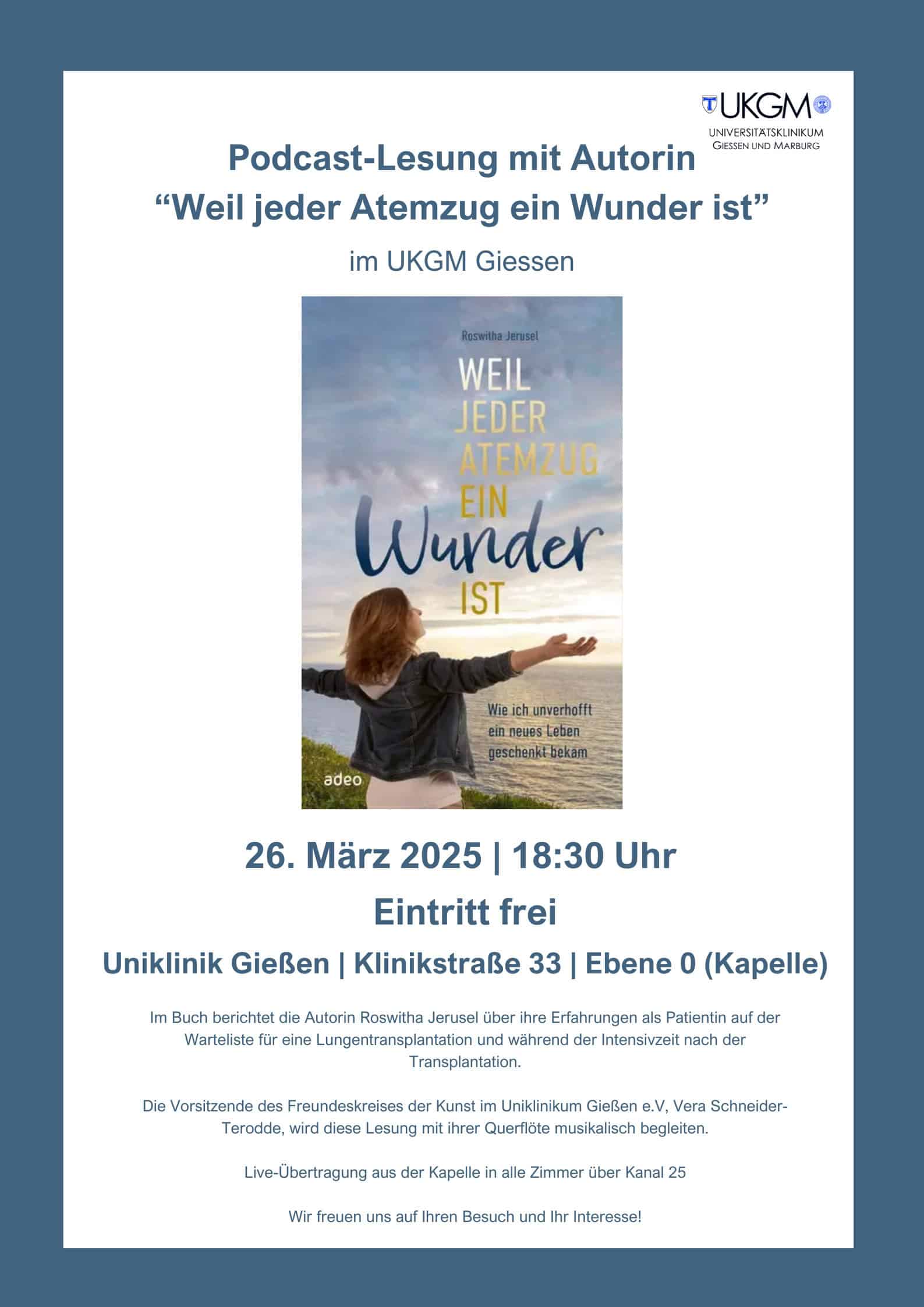 Am Mittwoch, den 26. März 2025 um 18.30 Uhr fand in der Kapelle des Uniklinikums Gießen eine Lesung mit Musik statt.